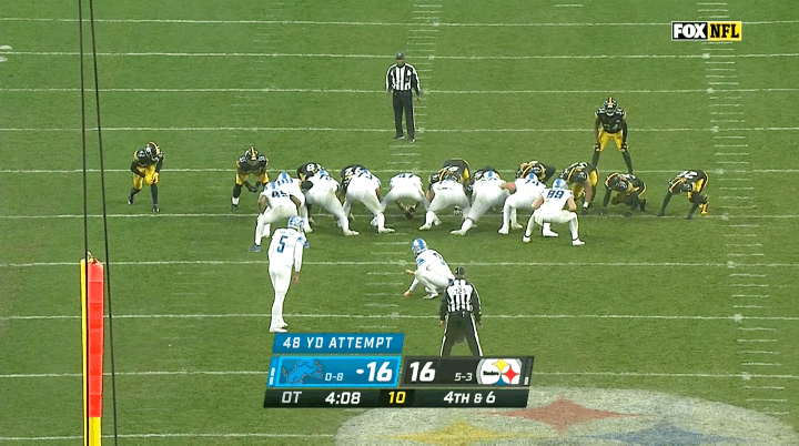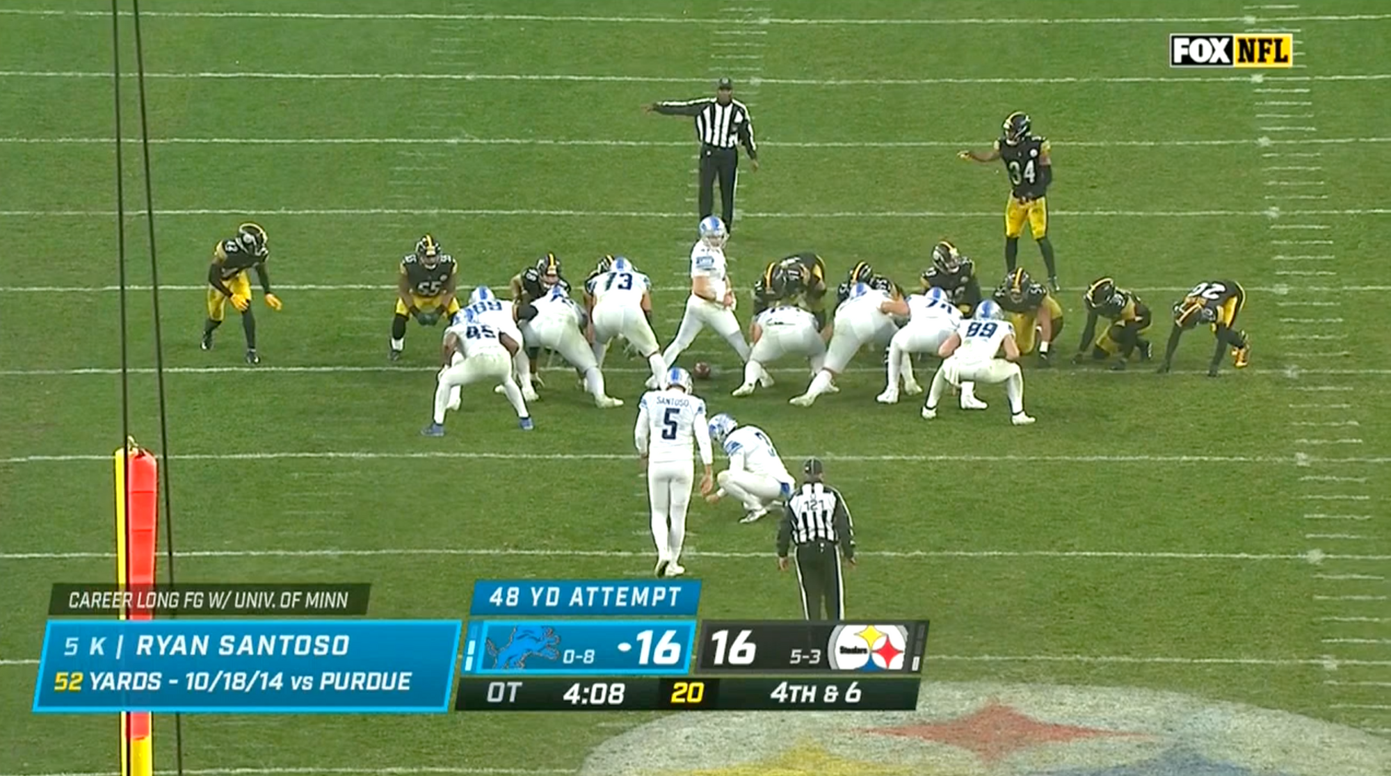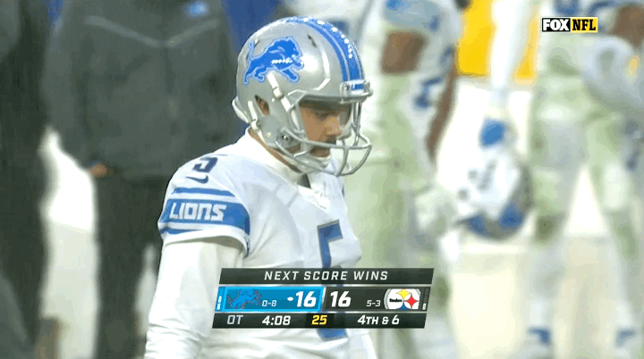 The last time I allowed myself to be sucked into the Lions’ pit of despair was Week 10, when Detroit's road game against the Pittsburgh Steelers went to overtime. With about four minutes remaining in the extra period, the contest was in sudden death as Detroit kicker Ryan Santoso walked onto the field to attempt a game-winning kick amid pouring rain. The camera tried to find its focus as a daunted Santoso tried to do the same, nervously wiping water from his mustache and glancing with dread at the goalposts located, by his apparent estimation, approximately three continents away. It was impossible to take in these images and conclude that Detroit had any chance of winning this game.