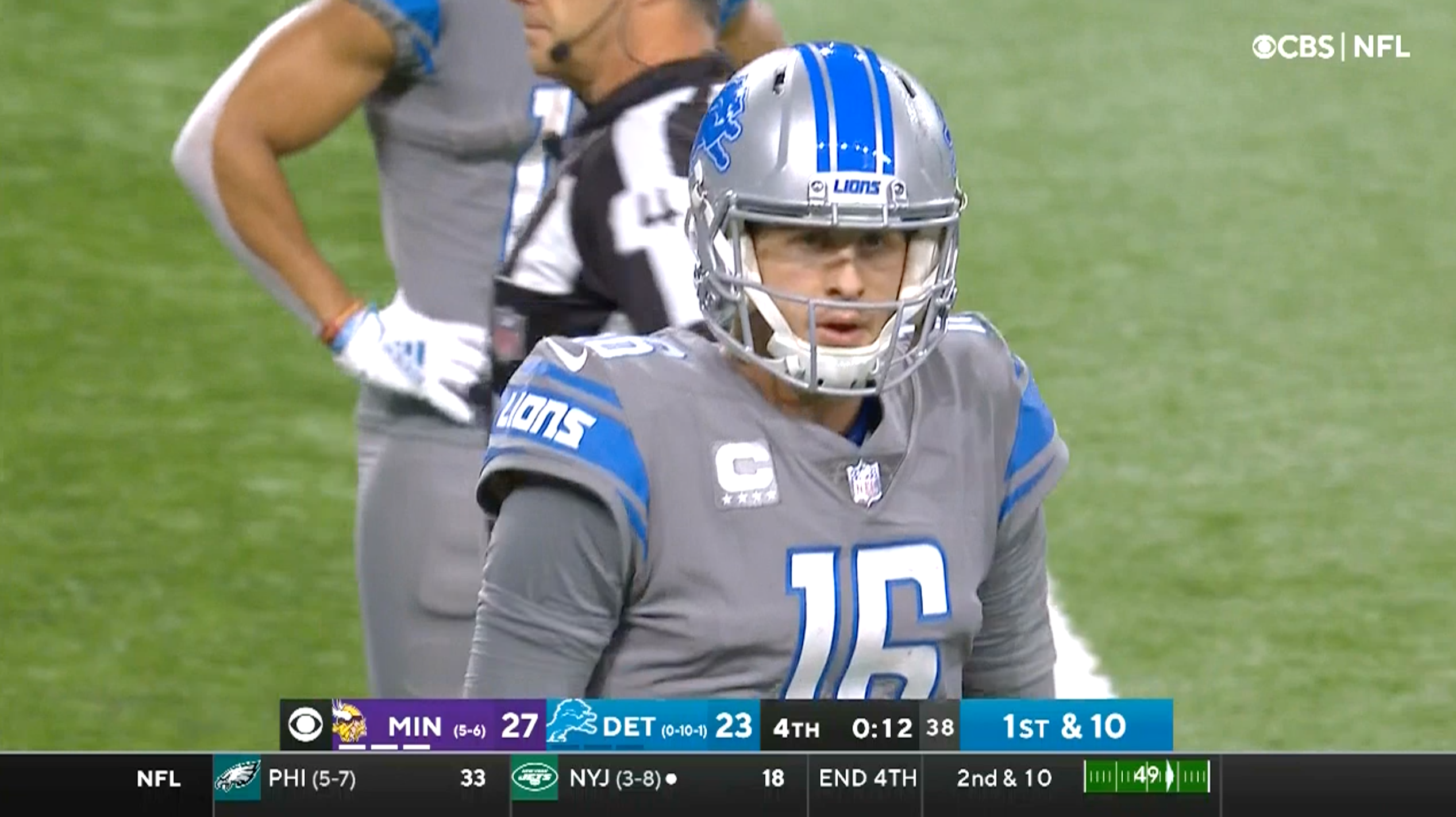 But the kicker, Patterson, would not be the player who finally determined the Lions’ fate this Sunday. That role would instead fall to quarterback Jared Goff, the player who has most inspired my quixotic desire to see the 2021 Lions win just once. In an offseason trade between the Lions and the Los Angeles Rams, Goff was shipped to Detroit in a quarterback-for-quarterback swap with Matthew Stafford. As Stafford put up big numbers for L.A. this season (especially early on), the TV networks have harped on the narrative that getting rid of Goff was the brilliant masterstroke the Rams needed—Goff bad, Stafford good.