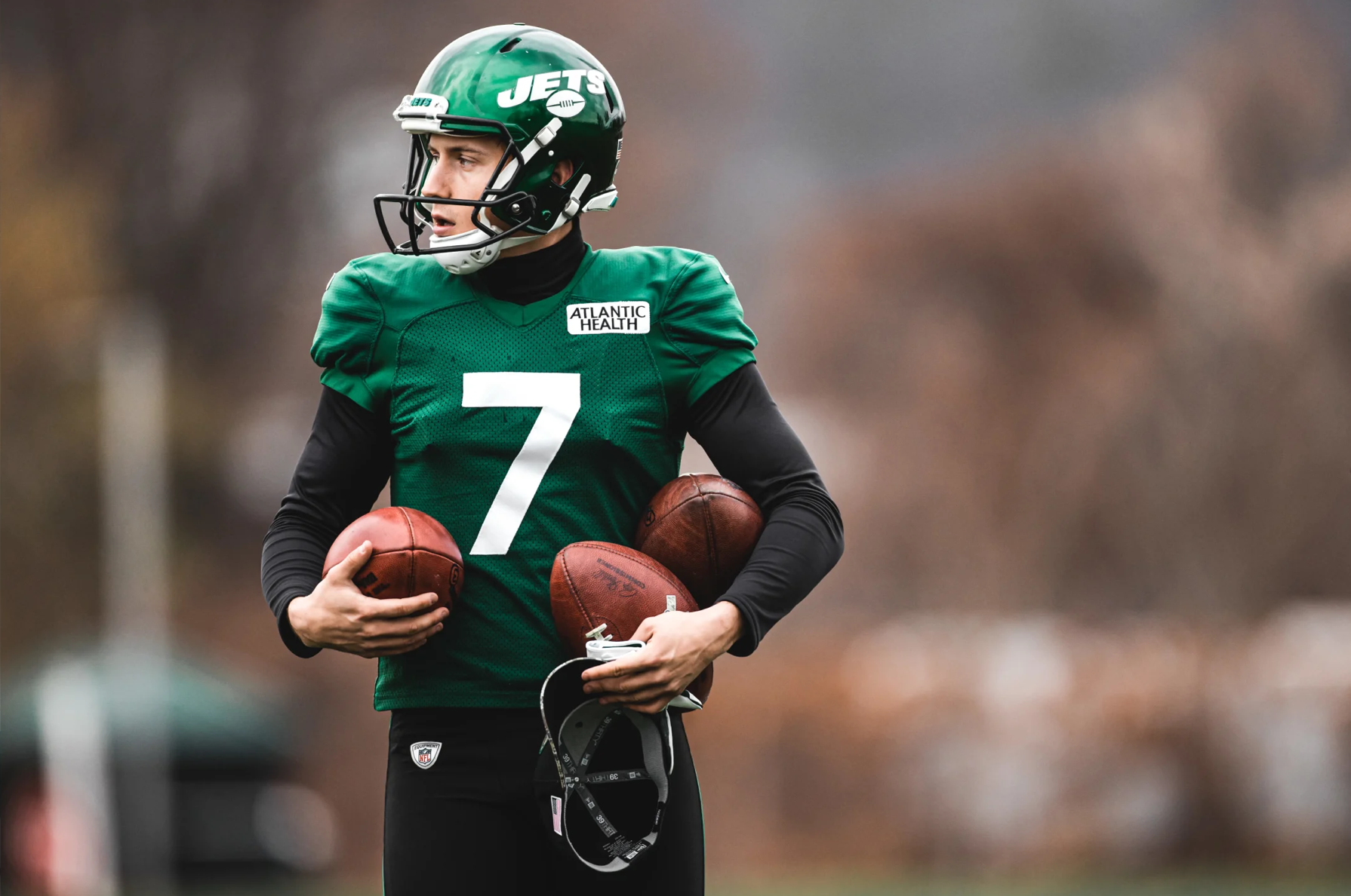 Here we see Jets punter Braden Mann trying to get into the act, too. But look again, Braden: One of your footballs is actually a hat. It’s all in the details!