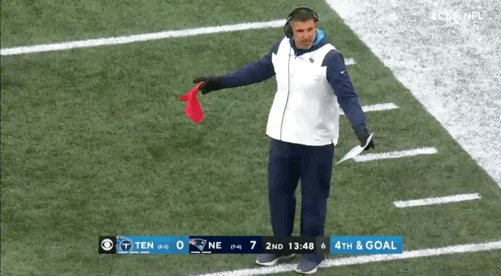 The red challenge flag has become a prominent form of self-expression for the headset-wearing ogres who prowl the sidelines. Take Mike Vrabel, the large and intense head coach of the Tennessee Titans, who earlier this season made waves—gravitational waves—when he violently fired his challenge flag into the ground to contest a play during the Titans’ loss to the New England Patriots. Geotechnical engineers in Foxborough are still working to repair the crater Vrabel’s fiery throw opened up in the Gillette Stadium playing surface.