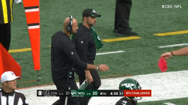 I admittedly haven’t gotten a good look at New York Jets head coach Robert Saleh’s flag-throwing form per se—I saw him challenge a play in the Jets’ game against the Cincinnati Bengals, but the actual flag toss happened off camera. Still, I made note of Saleh’s unique follow-up to this challenge, in which he collected his red flag and stalked over to Craig Wrolstad and put his hand on the referee’s hip to whisper sweet nothings in his ear—while Wrolstad was still making an announcement over the stadium PA! Wrolstad did not appear to mind Saleh’s tender caress. Who would? Saleh won the challenge.