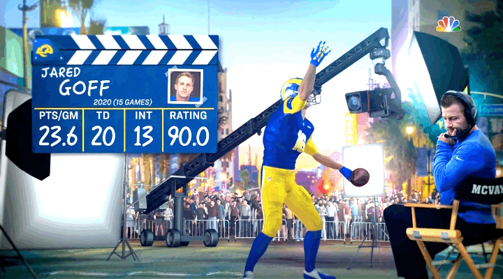 The above Sunday Night Football graphic from Week 9 is emblematic of this relentless storyline: It depicts fickle Rams coach Sean McVay as a film director losing interest in Goff and then "recasting" the quarterback role, reacting with nipple-stiffening delight at the flexes and showboating of Stafford. Goff led the Rams to a Super Bowl three seasons ago; now he features in heartless graphic sequences in which he gets the literal hook. It’s not that this characterization of events is false—Goff’s play has indeed been underwhelming since that Super Bowl year—but the matter-of-fact cruelty and relentless regurgitation of the narrative deepened my sympathies for the poor guy. I wanted to believe that someday, the game of pro football might once again allow Goff to taste just a soupçon of happiness.